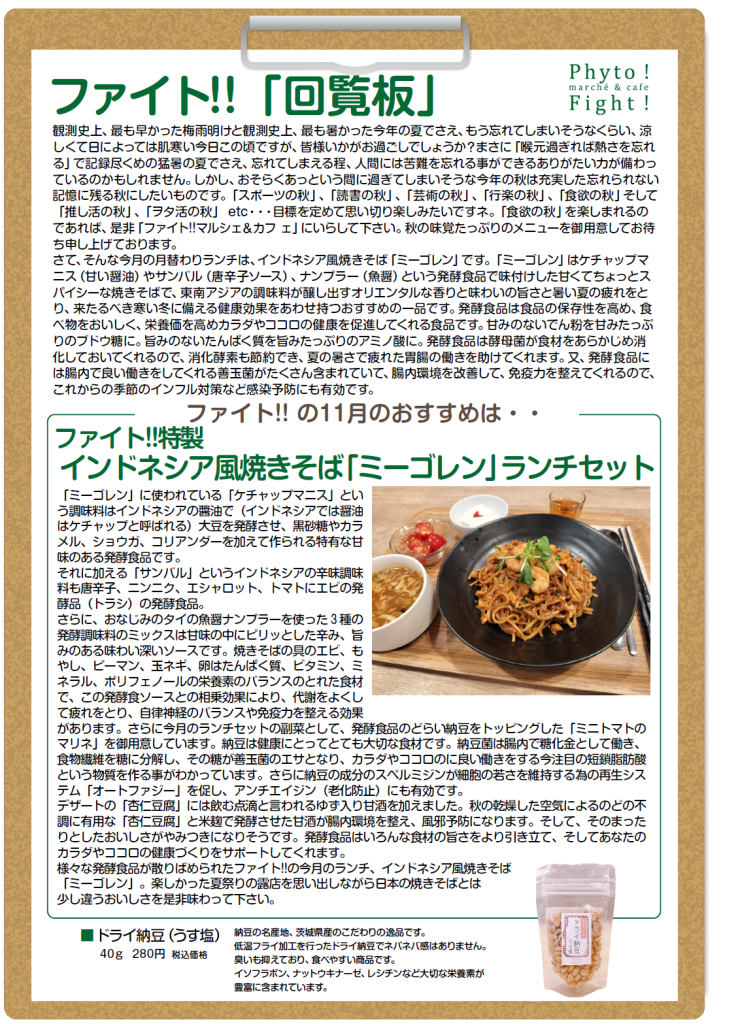 今月はインドネシア風の焼きそば『ミーゴレン』をメインにご用意しました。本場の調味料を使ったピリッと甘辛いソースが