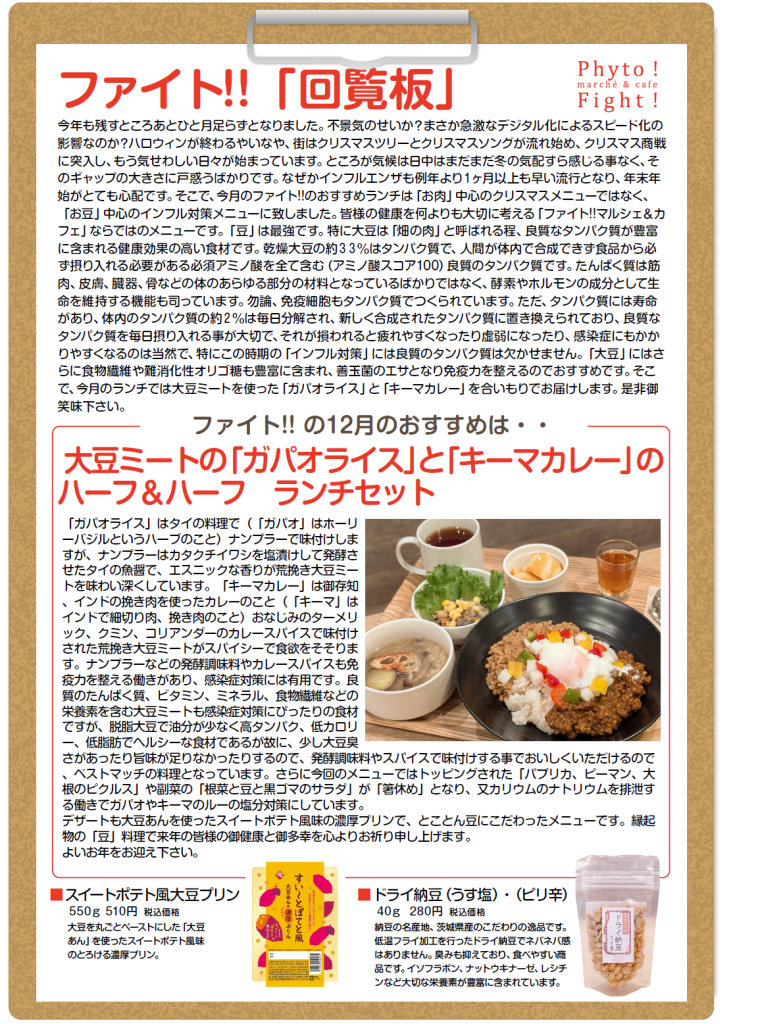 12月の月替わりランチ 大豆ミートの「ガパオライス」と「キーマカレー」のハーフ&ハーフ ランチセット ガパオライスとキーマカレーを合掛けにした贅沢な一品です。どちらも大豆ミートを使用した、お肉不使用のヘルシーなソースです。さっぱりした口当たりのパプリカ&大根のピクルスと温泉卵をトッピング。お好みで混ぜ合わせながらいろいろな味をお楽しみ下さい。食物繊維たっぷりの根菜のサラダ、スイートポテト風大豆プリン、黒豆茶も付いたボリューム感も満点のランチです。 月替りスープ、食物繊維入り食前酢付き1200円 税込価格
